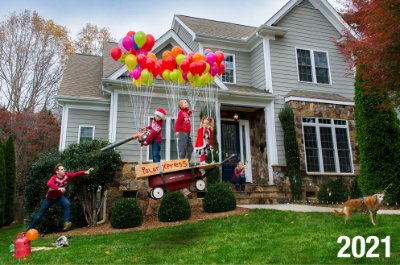 Look! The kids are taking off to the North Pole in their Flexible Flyer, with the help of helium balloons and a leaf blower -and not a lot of help from Rover. Dad is rushing in at the last minute to stop them, while Mom relaxes with a glass of wine. She knows it will all work out.