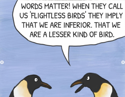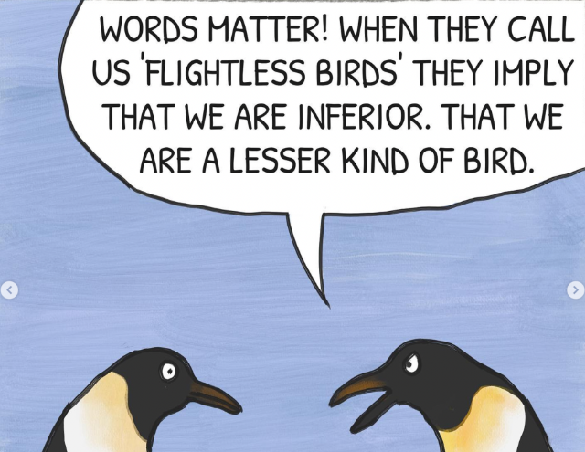 Does calling a penguin a "flightless bird" make them any lesser than other birds? Labels are important. Modifiers are important. The ego of an entire group may be at stake when we categorize them with terms that set them apart from the larger group. Yes, you may argue that most birds fly, so penguins are an outlier and cannot expected to be treated as the default. But flight is important to these two. Click to the right to advance the comic below to find out why.