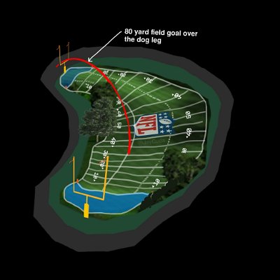 This one would set up a “dogleg”, permitting a field goal if the ball was kicked over the trees. A dogleg, a golf magazine explains, is a feature of some courses that rewards risk-taking players who are skilled enough to land a shot precisely.