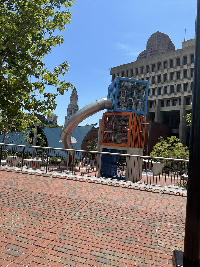The City Hall Plaza in Boston has recently renovated their outdoor playground. It now features a tall slide that is mostly a metal tube. Let's see how that works, as a Boston police officer takes his turn.