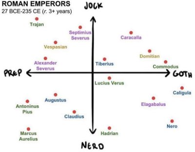 āTrajan, the greatest of emperors, provides excellent leadership by being both a supreme jock and prep. The underwhelming and self-absorbed perverts Nero, Caligula, and Elagabalus belong opposite of him. Marcus Aurelius was a true intellectual, but his armies would have benefited had he spent more time in the squat rack. Opposite him is Domitian, a brutally efficient ruler who left no meditations for modern young men to read, but did leave an empire stronger than he found it.